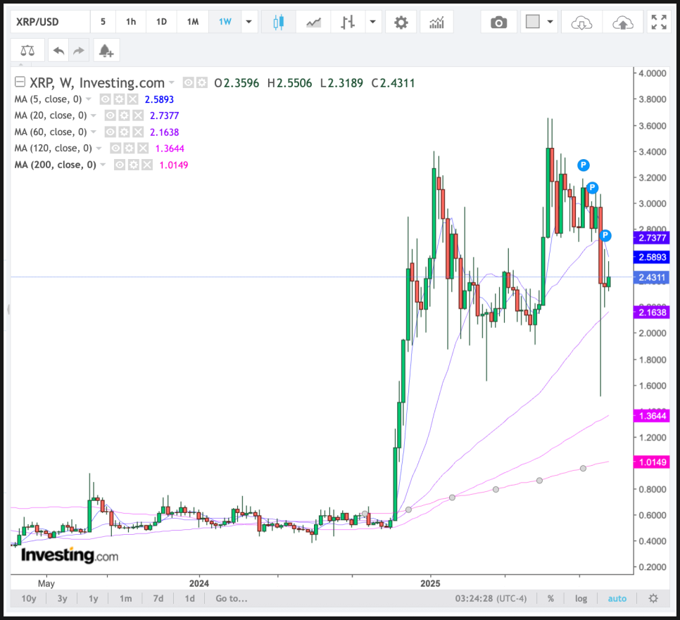 만약 향후 5주선을 돌파하면서 2.60달러 중반대를 회복할 수 있다면, 다시 3달러선 부근을 향한 반등 시나리오도 가능합니다. 하지만 이를 회복하지 못한 채 2.30달러 부근의 지지선이 무너지면, 다음 주요 지지 구간은 60주선이 위치한 2.16달러 부근이 될 가능성이 큽니다.