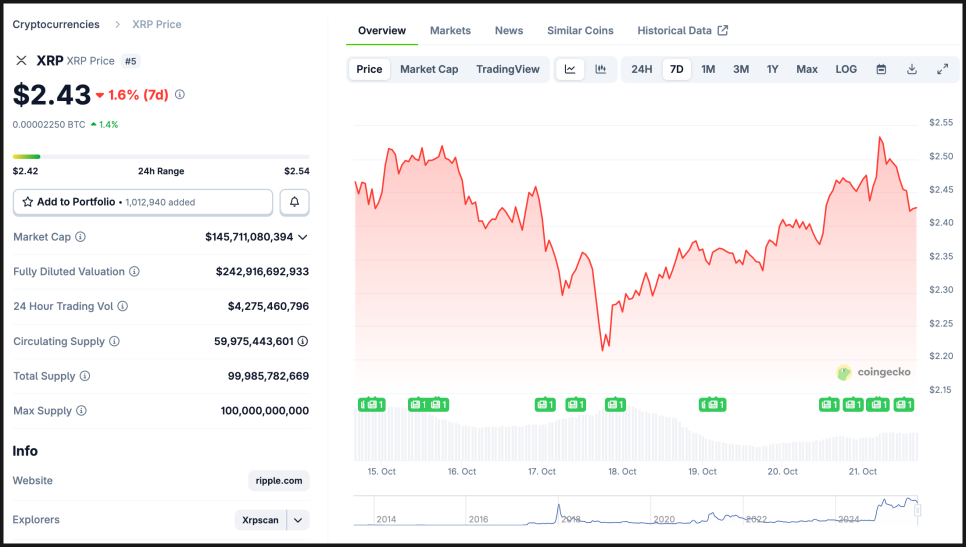 참고로 현재 리플 (XRP) 코인 가격은 지난 한 주 동안 1.6% 하락해 2.43 달러에서 거래되고 있고, 시가총액은 약 1,460억 달러 정도를 유지하고 있습니다.