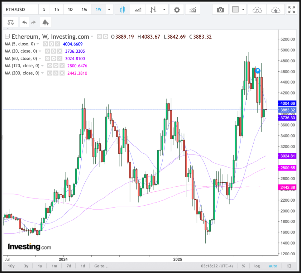따라서 현재 이더리움의 기술적 흐름을 종합하면, 단기적으로는 4,000달러 부근의 강한 저항에 막혀 약세 압력이 이어지고 있으며, 중기적으로는 20주선 근처에서 방향성을 모색 중이고, 장기적으로는 여전히 상승 추세선 위에 자리하고 있다는 점을 확인할 수 있습니다.