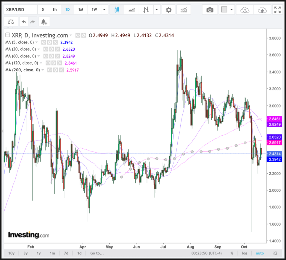 7월 중순 이후 리플은 3.6달러 부근에서 정점을 찍은 뒤 꾸준히 하락세를 이어왔고, 9월 이후에는 60일선이 강력한 저항선으로 작용하고 있습니다. 최근 반등이 나왔지만 20일선 돌파에 실패하면서 매도세가 다시 강화되는 모습을 보이고 있습니다.
