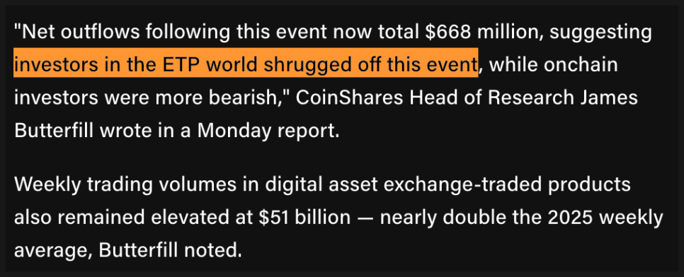이번 자금 유출은 10월 10일 발생한 대규모 청산 사태 직후 이어진 흐름입니다. 코인셰어스의 리서치 책임자인 제임스 버터필(James Butterfill)은 “온체인 투자자(on-chain investor)들이 보다 신중한 태도를 보이는 반면, ETF 투자자들은 시장 충격을 비교적 빠르게 소화했다”고 분석했습니다. 하지만 수치로만 봐도 상당한 자금이 실제로 이탈한 것은 분명하죠.