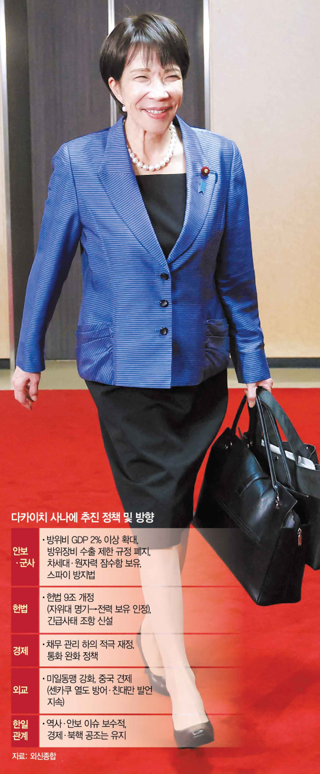 다카이치 사나에 신임 총리는 경제 분야에서는 확장재정과 완화적 금융정책을, 외교·안보 분야에서는 ‘강한 일본’을 기조로 방위력 강화 등에 힘쓸 것으로 관측