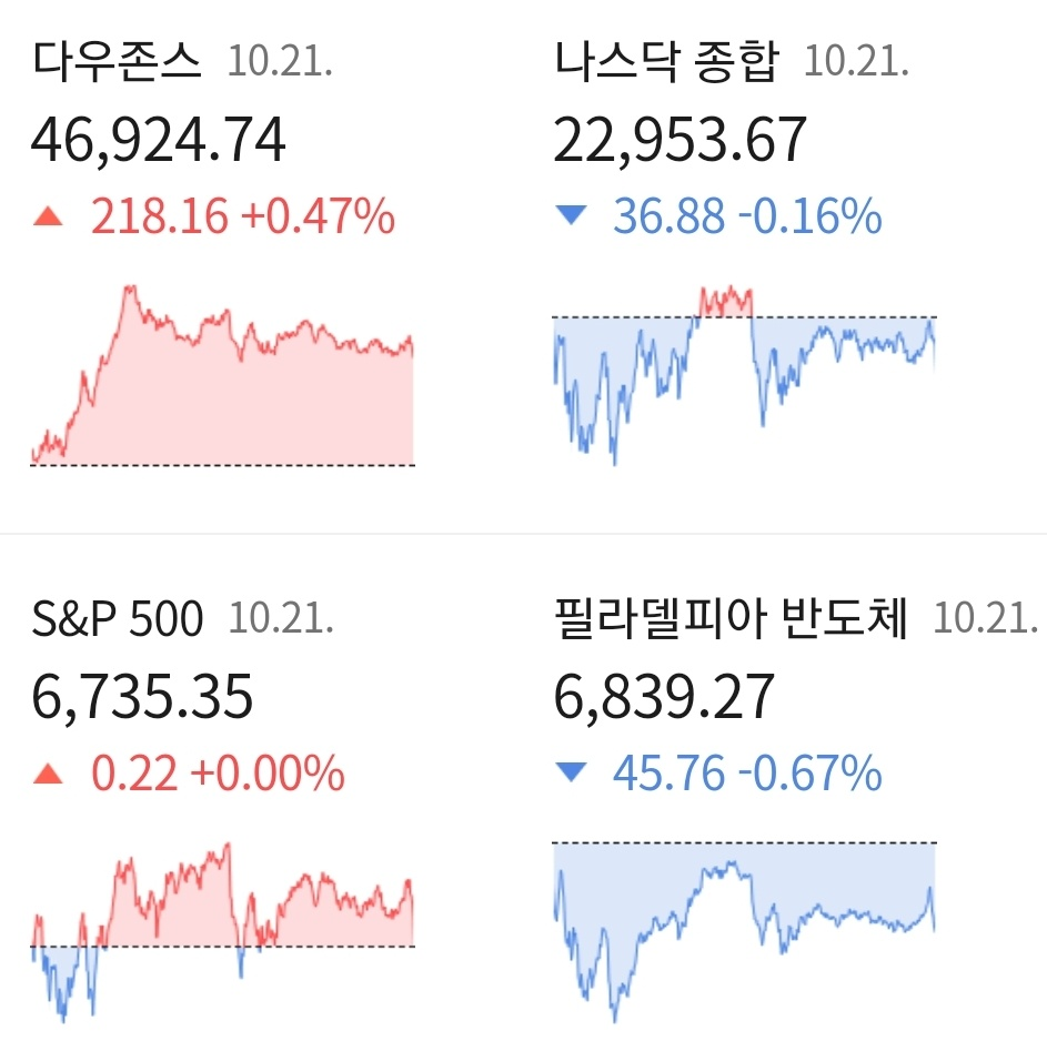 다우지수는 전일 대비 +0.47% 오른 46,924.74에 거래를 마쳤으며, 대형주 중심의 S&P500지수는 전장 대비 +0.00% 보합, 기술주 중심의 나스닥 지수는 전 거래일 대비 -0.16% 하락한 22,953.67에 거래를 마치며 장을 마감하였습니다.
