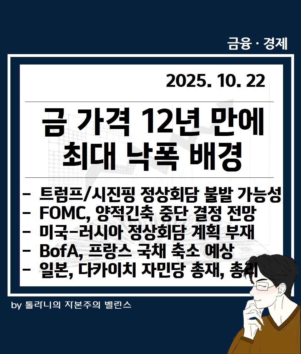 이에 '금 가격 폭락, 트럼프 및 시진핑 정상회담 불발 가능성 등 미국 증시 및 주요 국가 경제·금융 동향' 관련하여 언론 보도 및 국제금융센터 보고서를 통해 좀 더 자세히 알아보도록 하겠습니다.