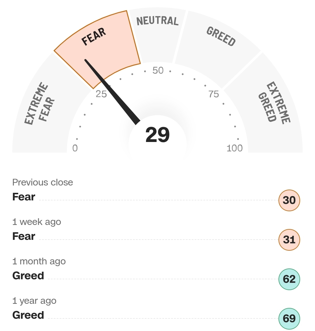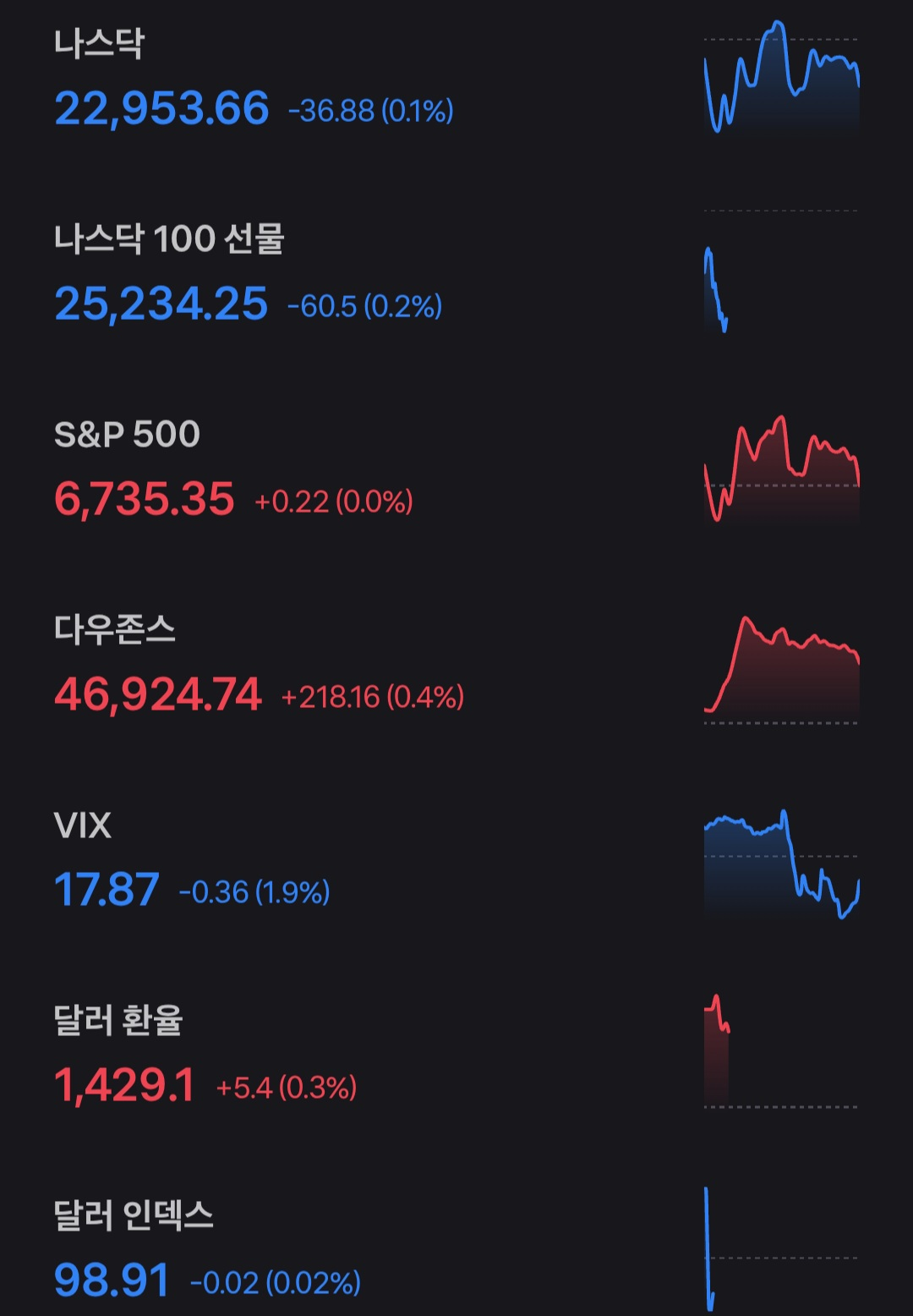 나스닥은 -0.1% 하락, S&P500은 보합, 다우지수는 +0.4% 상승으로 혼조세를 보였습니다. VIX 지수는 17.8로 하락하며 단기 공포심리가 완화되었지만 공포·탐욕지수는 29로 여전히 ‘공포’ 구간에 머물러 있습니다. 이는 시장이 방향성을 확정짓지 못하고 단기 변동성에 민감하게 반응하고 있음을 의미합니다. 특히 금값 급락과 같은 안전자산 내 변동성은 투자자들의 심리가 불안정하다는 단적인 예로 볼 수 있겠습니다.