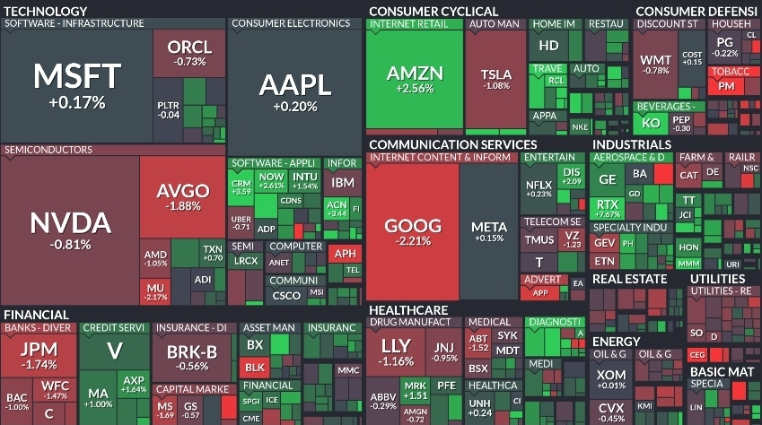 기술주 중심의 장세는 여전히 이어지고 있으나 NVDA(-0.81%), AVGO(-1.88%) 등 반도체주는 차익 매물이 출회되며 조정을 받았습니다. 반면 아마존(+2.56%)은 AI 자동화 확대 기대감으로 상승했고 금융·에너지 섹터도 소폭 강세를 보였습니다. 시장의 중심은 점차 단기 성장주에서 실적 기반의 가치주로 이동하는 모습이며 이는 연말 랠리 구간의 순환매 가능성을 시사합니다.