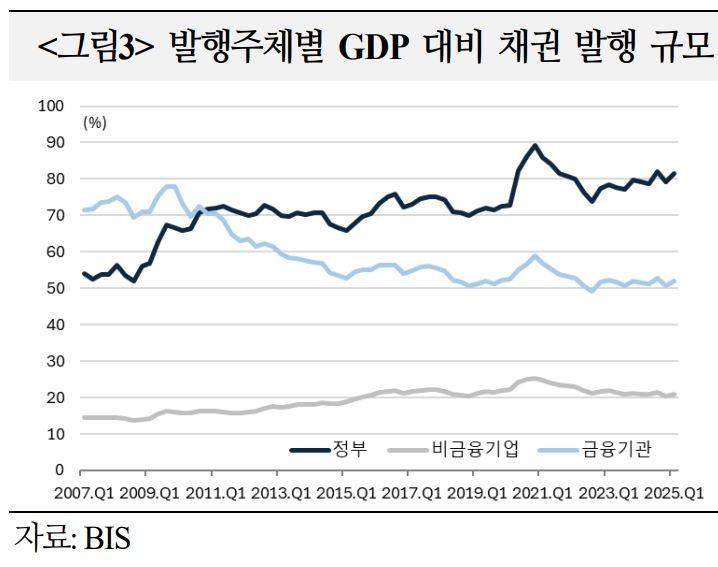 ㅇ 글로벌 채권 발행잔액 중 국채 비중은 `07년말 38% → `25.1분기말 52%로 급증. 글로벌 GDP 대비로는 54% → 81%로 큰 폭 증가