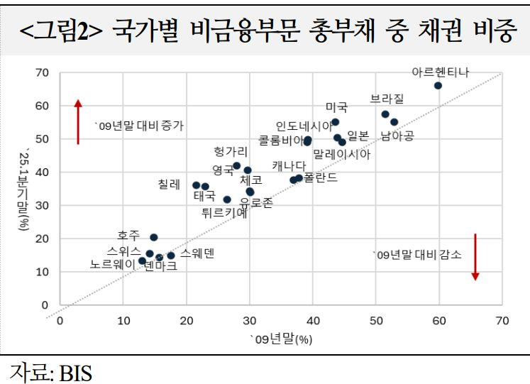 ㅇ 총부채에서 대출보다 채권 발행의 중요성이 커지면서 주요 대출 주체인 은행의 위험 익스포저는 축소된 반면, 주요 채권 매수자인 비은행금융중개기관 위험은 확대
