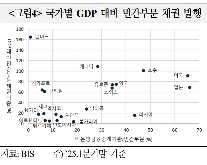 - 커버드본드 발행이 활발한 오스트리아, 덴마크, 독일 등은 은행이, MBS 시장이 큰 미국, 호주, 캐나다, 영국 등은 비은행금융중개기관 비중이 컸으며, 신흥국은 비금융기업 발행이 민간부문을 주도