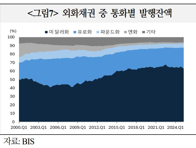 - 외화채권(foreign currency bond) 중 미 달러화 비중은 `07년말 43% → `25.1분기말 65% 증가. 반면 유로화는 32% → 23%, 파운드화는 9% → 5%, 엔화는 5% → 2%로 감소