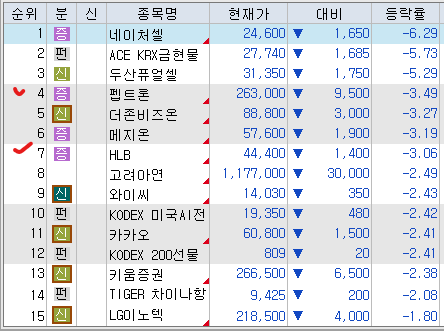 <시총 1조 원 이상 등락률 상위 종목>