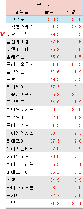 매도 : 포스코퓨처엠 Posco홀딩스 성우하이텍 팬오션 포스코인터내셔널 LG화학 에코프로 휴림로봇(+186.24%) 하이드로리튬 에코프로비엠 코난테크놀리지 LS머트리얼 클로봇(+133.71%)