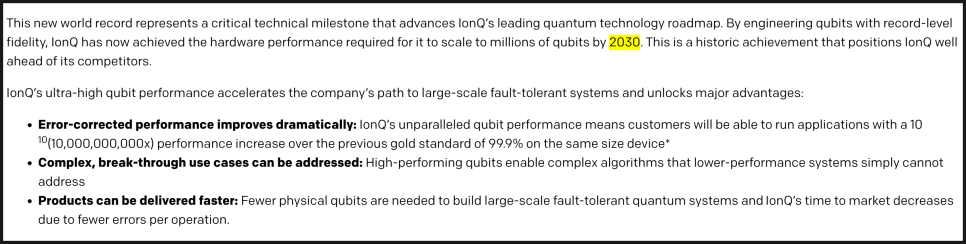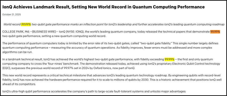 지난 2025년 10월 21일, 아이온큐는 자사 EQC(Electronic Qubit Control) 기술을 통해 세계 최고 수준의 2큐빗 게이트 정밀도 99.99%를 달성했다고 발표했습니다. 기존 기록은 2024년 Oxford Ionics(현재 아이온큐 자회사)가 세운 99.97%였는데, 이번 성과로 업계 기준을 다시 쓴 셈입니다.