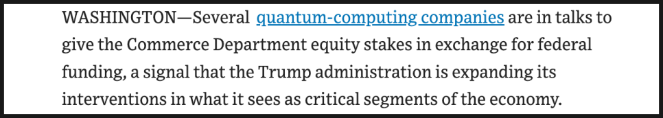 며칠 뒤, 또 하나의 빅뉴스가 터졌습니다. The Wall Street Journal 보도에 따르면, 미국 상무부가 아이온큐를 비롯한 주요 양자컴퓨팅 기업들에 지분 투자를 검토 중이라고 합니다. 최소 1,000만 달러 이상의 지원을 전제로 정부가 직접 주주로 참여하는 방식입니다.