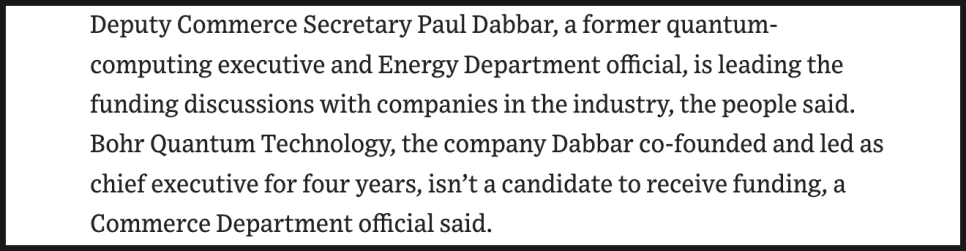 현재 상무부의 자금 지원 논의를 주도하고 있는 인물은 폴 대버(Paul Dabbar) 부상무장관입니다. 그는 과거 양자컴퓨팅 업계에서 활동했으며 에너지부 관료를 지낸 경력이 있습니다. 그가 공동 설립하고 4년간 CEO를 맡았던 보어 퀀텀 테크놀로지(Bohr Quantum Technology)는 이번 지원 대상에서 제외됐다고 상무부 관계자가 밝혔습니다.