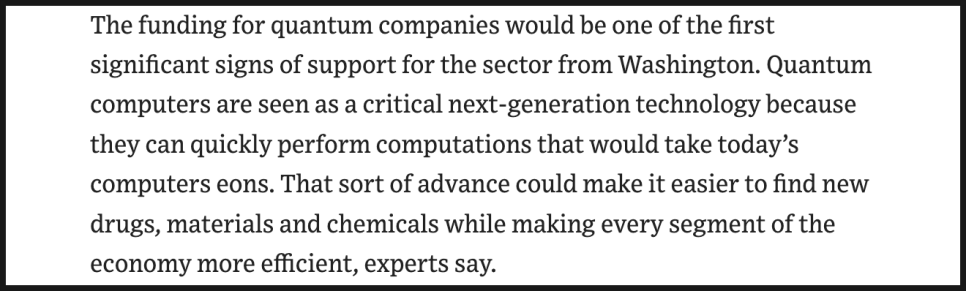 이번 양자컴퓨팅 분야의 자금 지원은 워싱턴이 이 산업에 본격적으로 힘을 싣는 첫 번째 주요 신호 가운데 하나로 평가됩니다. 양자컴퓨터는 현존 슈퍼컴퓨터로는 ‘수억 년이 걸릴’ 연산을 빠른 시간 안에 처리할 수 있는 차세대 기술로, 신약 개발이나 신소재 연구, 화학 공정 혁신 등 광범위한 분야에서 경제 전반의 효율성을 끌어올릴 핵심 기술로 주목받고 있습니다.