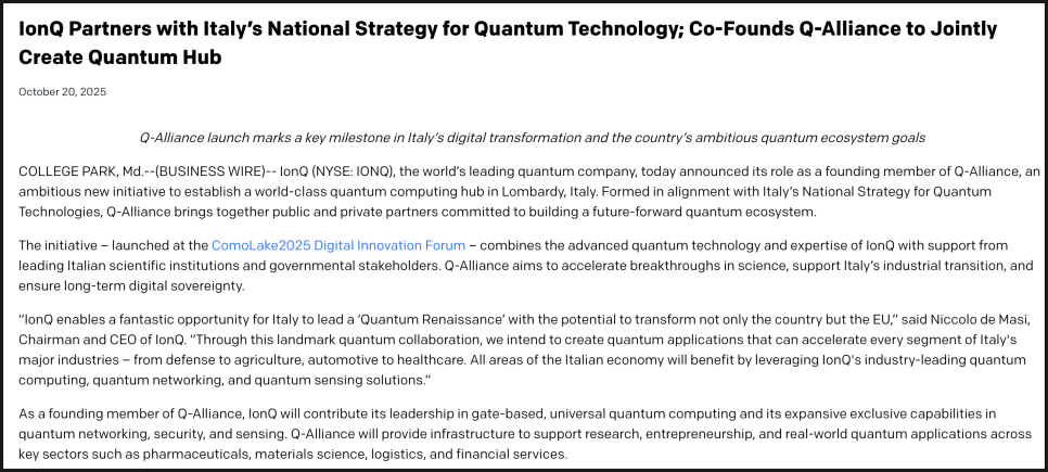 아이온큐는 기술 개발에만 집중하고 있지 않습니다. 글로벌 사업 확장에도 속도를 내고 있습니다. 지난 2025년 10월 20일, 아이온큐는 이탈리아 롬바르디아 지역에 Q-Alliance라는 양자컴퓨팅 허브를 설립하는 프로젝트의 공동 설립자로 참여한다고 밝혔습니다. 이 프로젝트는 이탈리아 정부의 국가 양자기술 전략에 맞춰 추진되는 핵심 사업입니다.
