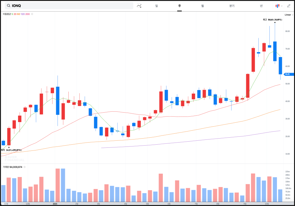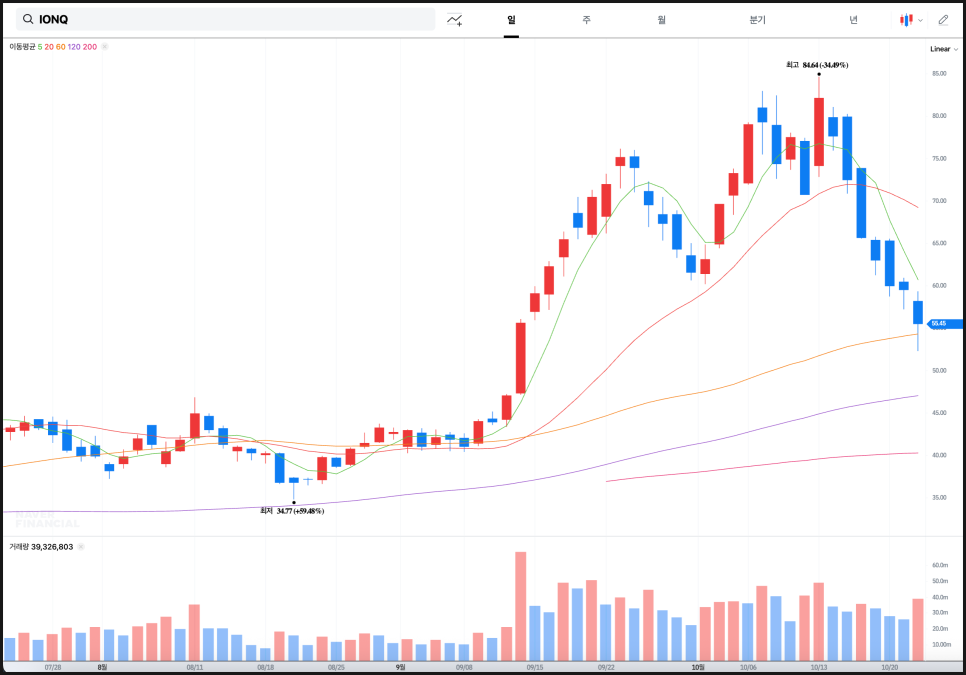일봉 기준으로 아이온큐는 9월 중순 이후 주가는 강한 상승 랠리를 이어갔습니다. 저점이었던 34.77달러에서 10월 초 고점 84.64달러까지 단기간에 약 140% 상승하면서 매수세가 집중적으로 몰렸습니다. 이 시기에는 강한 양봉이 연속으로 형성됐고, 거래량도 폭발적으로 증가했습니다.