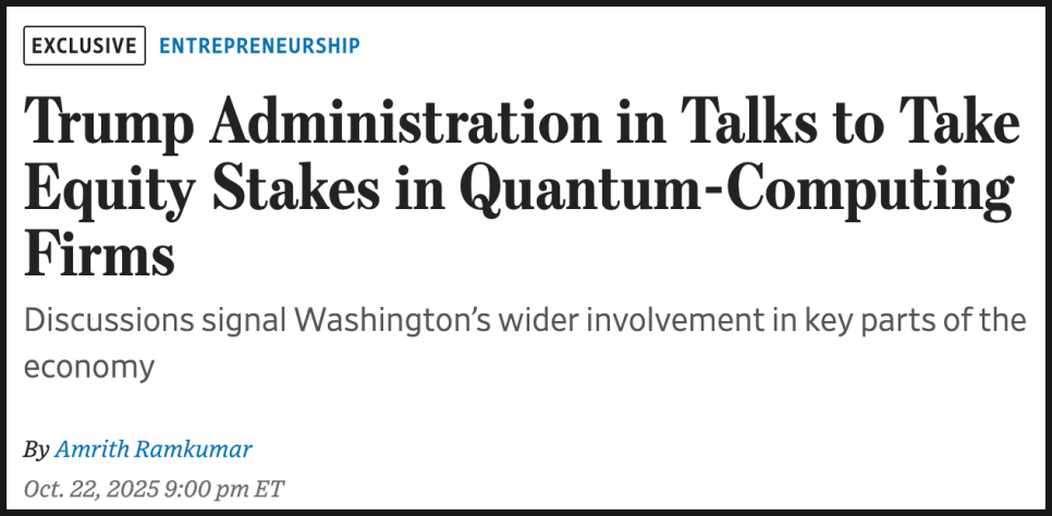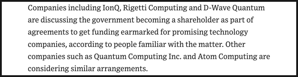 워낙 중대한 뉴스이기 때문에 단독 기사 전문을 살펴보도록 하겠습니다. 제목은 "미국 정부, 양자컴퓨팅 기업에 ‘지분 투자’ 협의 중 핵심 산업에 대한 워싱턴의 개입 확대 신호"입니다.