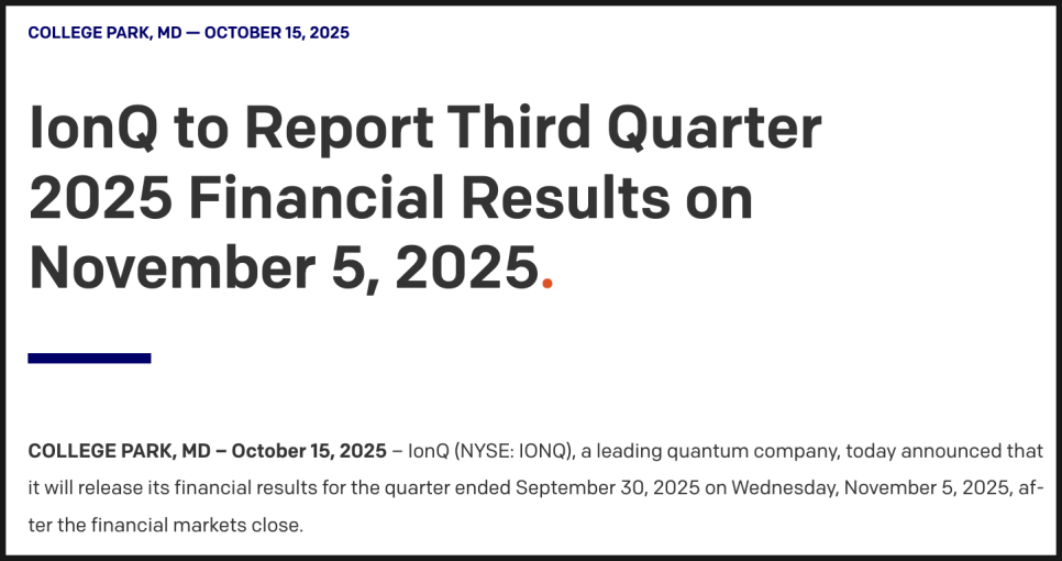 참고로 아이온큐 실적 발표 일정도 다가오고 있습니다. 2025년 11월 5일(수) 미국 장 마감 이후 2025년 3분기 실적을 발표할 예정입니다. 기술적 이벤트에 정책 뉴스가 겹친 상황에서 실적이 어떤 결과를 내놓느냐에 따라 주가의 단기 흐름이 크게 요동칠 가능성이 있겠습니다.