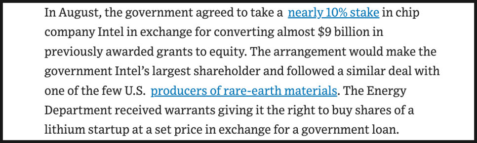 실제로 지난 8월, 미국 정부는 인텔(Intel) 지분 약 10%를 확보하기로 합의했습니다. 기존에 지급된 90억 달러 규모의 보조금을 지분 전환하는 방식이었는데요, 이로써 미국 정부는 인텔의 최대 주주가 될 예정입니다. 이는 희소금속 생산 기업과의 유사한 지분 투자에 이은 또 다른 사례입니다. 또한 에너지부는 리튬 스타트업에 대출을 제공하는 대신, 미리 정해진 가격으로 주식을 매입할 수 있는 워런트(매입권)도 확보했습니다.