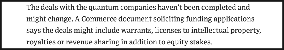 양자컴퓨팅 기업들과의 협상은 아직 최종 확정되지 않았으며, 조건이 변동될 가능성도 있습니다. 상무부의 자금 지원 신청 공문에 따르면 이번 계약에는 지분뿐만 아니라 워런트(매입권), 지식재산권 사용 허가, 로열티나 수익 공유 조건이 포함될 수 있다고 명시돼 있습니다.