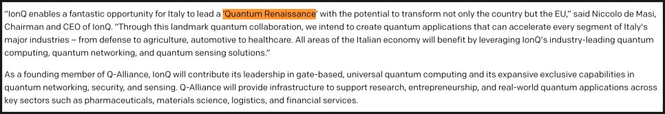 Niccolo de Masi CEO는 이번 협력이 “이탈리아와 유럽이 양자 르네상스를 이끄는 전환점이 될 것”이라고 강조했는데요. Q-Alliance는 아이온큐의 양자 하드웨어와 네트워킹 기술, 이탈리아 과학계와 산업계, 정부의 지원이 결합된 협력체로, 산업 전반에서 양자 응용 프로그램을 개발하고 디지털 주권을 강화하는 것을 목표로 한다고 합니다. 제약, 소재, 물류, 금융 같은 전략 산업에서 실제 상용화를 위한 연구·창업 인프라를 제공하고, 장학금·인턴십 프로그램을 통해 차세대 양자 인재 양성에도 나설 예정입니다.