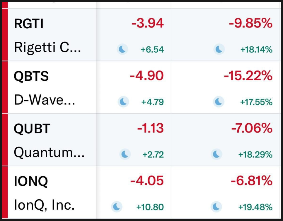 리게티 컴퓨팅(Rigetti Computing)과 디웨이브 퀀텀(D-Wave Quantum), 퀀텀 컴퓨팅(Quantum Computing Inc.) 역시 17~19%에 달하는 강한 시간외 랠리를 보였습니다.
