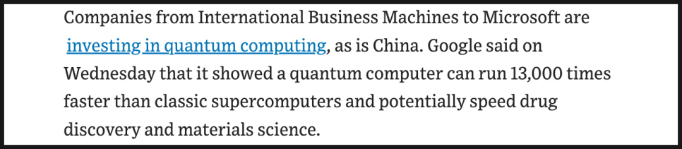 IBM(International Business Machines), 마이크로소프트(Microsoft) 등 글로벌 대기업은 물론, 중국 역시 양자컴퓨팅에 막대한 투자를 이어가고 있습니다. 구글(Google)은 10월 22일 자사 양자컴퓨터가 기존 슈퍼컴퓨터보다 13,000배 빠른 속도로 연산을 수행했다고 발표하면서, 신약 및 소재 개발 분야에서 속도 혁신을 이끌 수 있다고 강조했습니다.