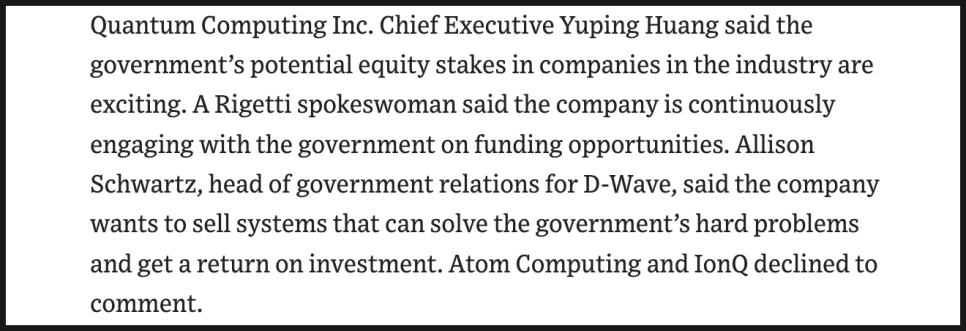 퀀텀 컴퓨팅(Quantum Computing Inc.)의 CEO인 위핑 황(Yuping Huang)은 정부가 기업 지분을 보유할 가능성에 대해 “매우 고무적”이라는 입장을 밝혔습니다. 리게티 컴퓨팅(Rigetti Computing) 측 대변인은 “지속적으로 정부와 자금 지원 기회를 논의하고 있다”고 전했고, 디웨이브 퀀텀(D-Wave Quantum)의 정부 협력 담당 임원인 앨리슨 슈워츠(Allison Schwartz)는 “정부의 난제를 해결할 수 있는 시스템을 공급하고 투자 수익도 창출하고 싶다”고 말했습니다. 한편, 아톰 컴퓨팅(Atom Computing)과 아이온큐(IonQ) 측은 코멘트를 거부했습니다.