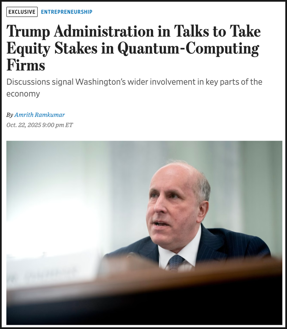 두 번째, 미국 상무부가 아이온큐를 비롯한 주요 양자컴퓨팅 기업에 지분 투자를 검토하고 있는 사실이 월스트리트저널에 의해 단독 보도됐습니다. 단순한 지원을 넘어, 미국 정부가 전략 기술 기업의 주주로 참여하려는 신호로 해석됩니다.