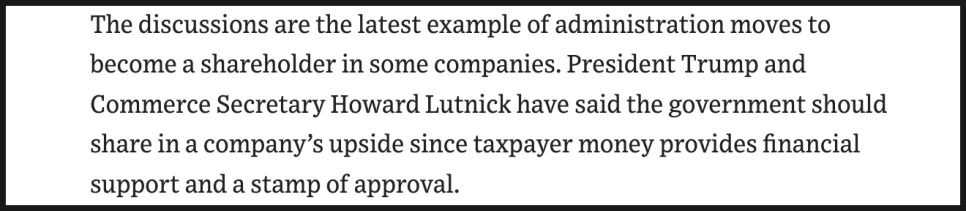 이러한 협상은 트럼프 행정부가 기업의 주주로 직접 참여하려는 최근 기조의 연장선에 있습니다. 트럼프 대통령과 하워드 루트닉(Howard Lutnick) 상무장관은 “국민 세금이 기업에 자금과 신뢰를 제공하는 만큼, 정부도 그 과실을 공유해야 한다”는 입장을 공개적으로 밝혀왔습니다.