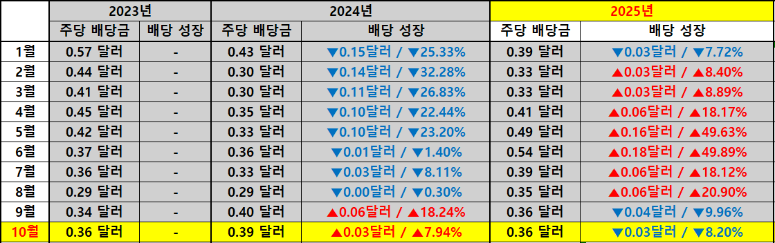 지난해 같은 시점의 시가배당률 8.02%와 비교하면 약 0.42%p 하락했지만 여전히 월배당 ETF 중에서는 상위권 수준을 유지하고 있습니다. 이는 주가가 1년 전보다 소폭 하락(58.69달러 → 56.85달러, 약 -3.14%)했음에도 배당금 감소폭이 더 컸기 때문입니다.