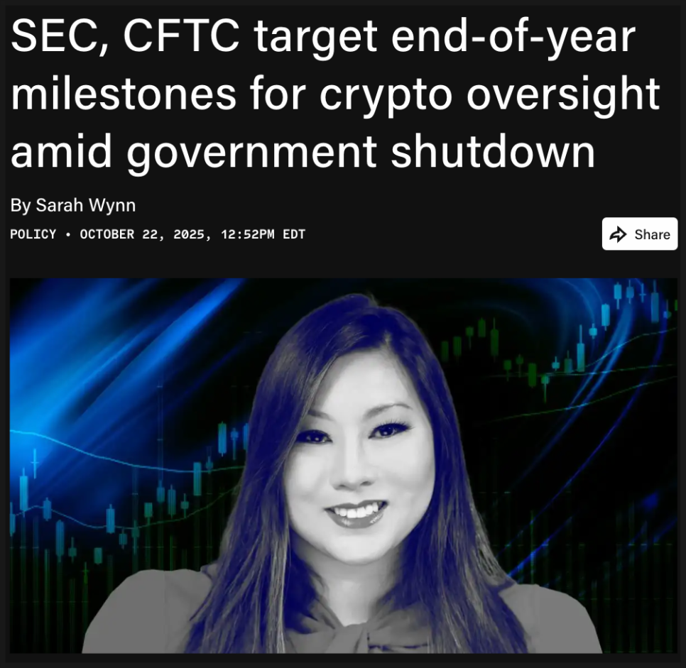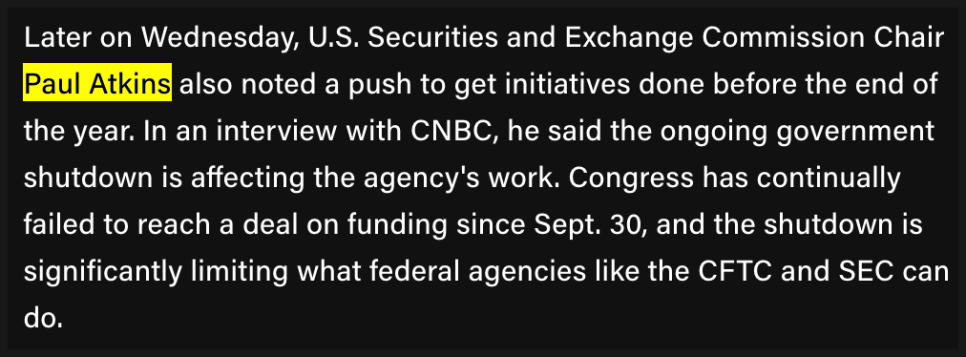 폴 앳킨스(Paul Atkins, Paul Atkins) SEC 위원장 역시 같은 시점에 규제 개혁과 새로운 제도를 추진 중이라고 밝혔습니다. 하지만 현재 미국은 9월 30일부터 이어지고 있는 셧다운(예산안 합의 실패로 정부 기능이 멈춘 상태)으로 인해 SEC와 CFTC의 인력이 제한적으로만 근무 중입니다. 이로 인해 정책 초안 작성과 제도 설계 작업이 늦어지고 있는 상황이죠.