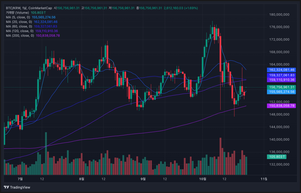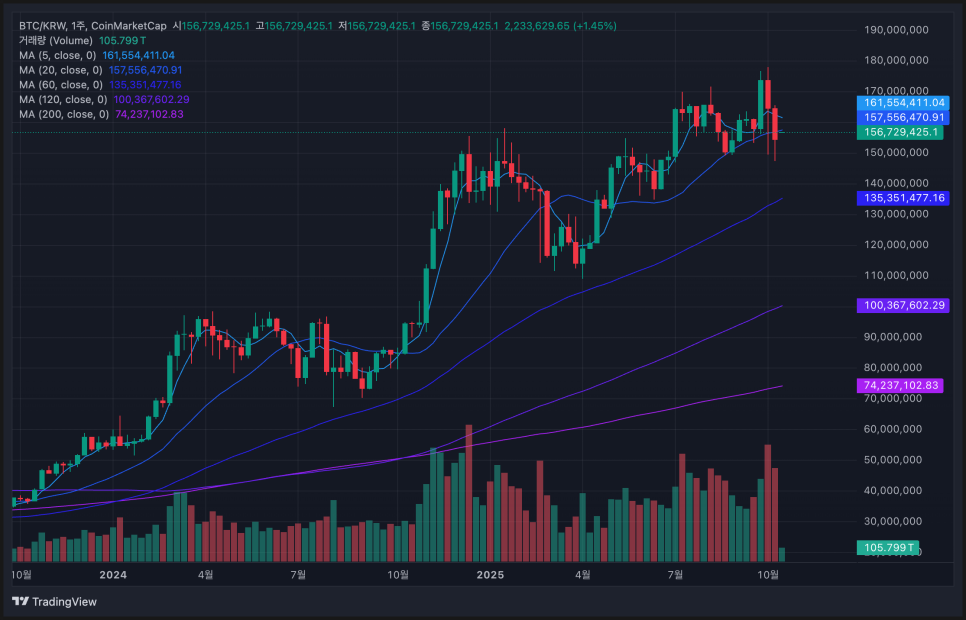 먼저 일봉 차트부터 보겠습니다. 최근 가격은 약 1억 5천만 원 중반에서 움직이고 있는데요, 단기 이동평균선(5일선)과 중기선(20일선) 사이에서 방향을 모색하는 모습입니다. 고점에서 한 차례 강하게 밀린 뒤 반등이 나왔지만, 위쪽 저항이 뚜렷해 보이는 구간이죠. 특히 20일선 부근에서 가격이 자주 머무르고 있는데, 이 선을 깨고 아래로 내려가면 조정이 깊어질 수 있고, 반대로 위로 안착한다면 단기 상승 흐름이 다시 이어질 가능성이 생깁니다.