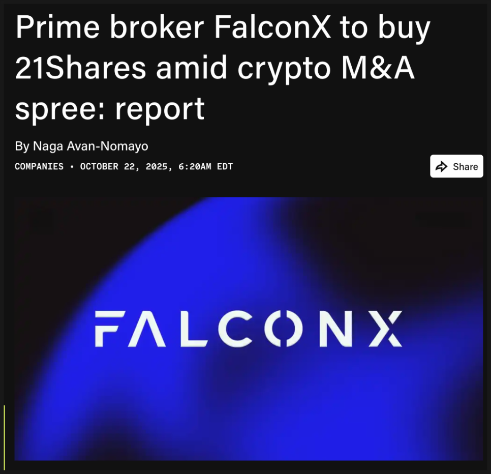 최근 팔콘엑스(FalconX)가 투원셰어스(21Shares)를 인수하기로 하면서 시장의 시선이 집중되고 있습니다. 인수 금액은 공개되지 않았지만 그 의미는 분명합니다. 이는 기관 투자자 시장에서 주도권을 확보하기 위한 전략적 행보입니다.