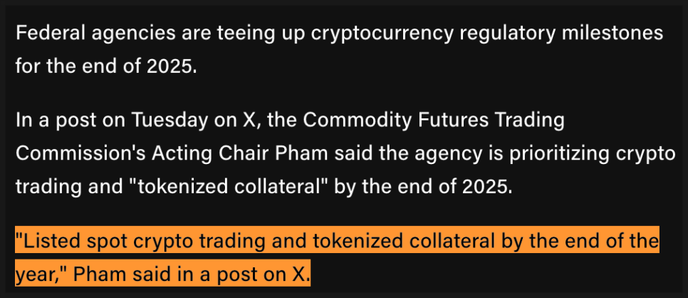 그 흐름이 곧 달라질 가능성이 커지고 있습니다. 캐롤라인 팜(Caroline Pham) CFTC 의장 직무대행은 2025년 연말까지 ‘현물 암호화폐 거래’와 ‘토큰화된 담보(tokenized collateral)’ 관련 제도를 마련하는 것을 목표로 한다고 밝혔습니다. 여기서 ‘현물 거래’란 코인을 실제로 사고파는 거래를 뜻하고, ‘토큰화된 담보’는 디지털 자산을 담보로 활용해 금융거래에 연결하는 구조를 의미합니다.
