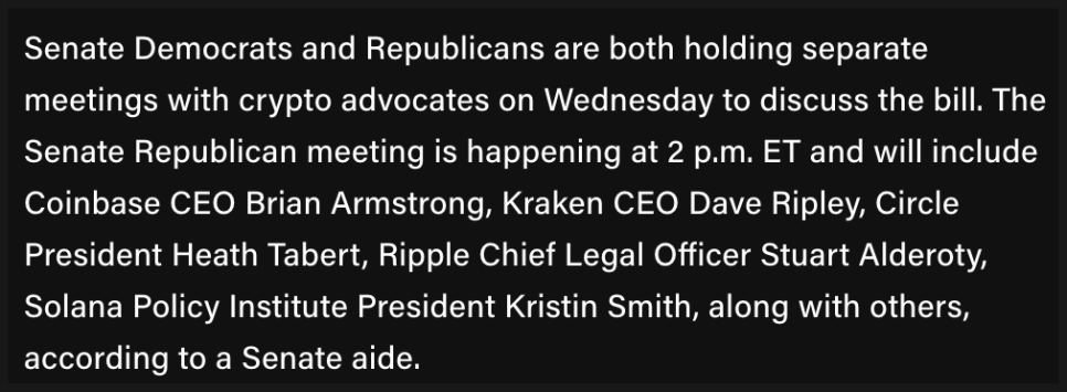 입법 움직임도 빠르게 진행되고 있습니다. 코인베이스 CEO 브라이언 암스트롱(Brian Armstrong), 크라켄 CEO 데이브 리플리(Dave Ripley), 써클 사장 히스 타버트(Heath Tarbert), 라플 CLO 스튜어트 알데로티(Stuart Alderoty), 솔라나 정책 연구소 의장 크리스틴 스미스(Kristin Smith) 등 업계 핵심 인사들이 상원 의원들과 만나 법안 통과를 압박하고 있습니다. 이 법안이 올해 안에 통과될 경우, 미국 암호화폐 역사에서 가장 중요한 규제 분기점이 될 가능성이 큽니다.