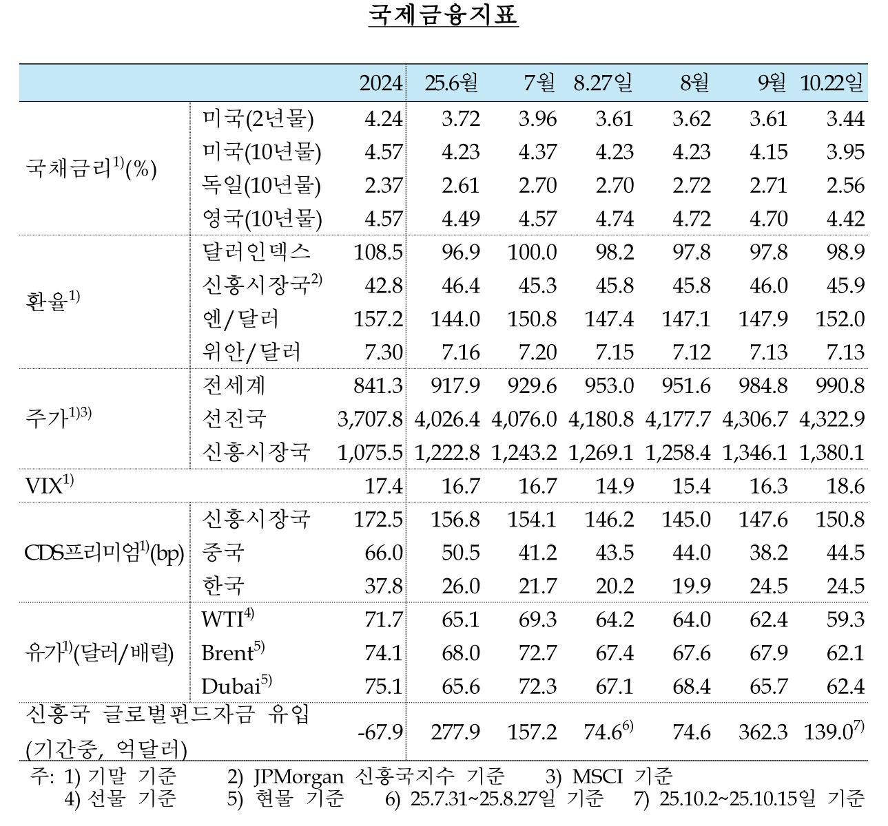 ㅇ 국제금융시장에서는 장기 국채금리가 미 연준의 금리 인하, 미‧중 무역갈등 재부각 등으로 하락하였고, 미 달러화는 주요국 재정건전성 우려 등에 영향 받으며 상당폭 등락하였다. 주가는 AI 관련 부문을 중심으로 높은 상승세를 이어갔다.