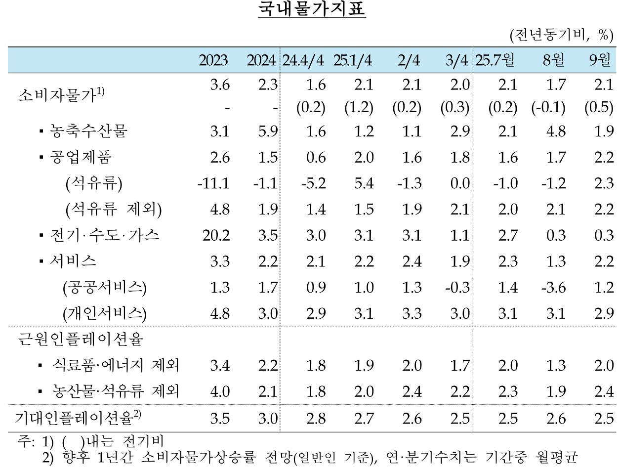 ㅇ 국내 물가는 9월 중 소비자물가 상승률이 2.1%, 근원물가 상승률(식료품및 에너지 제외 지수)이 2.0%를 각각 나타내는 등 안정적인 흐름을 이어갔다. 단기 기대인플레이션율(일반인)은 9월 중 2.5%로 전월(2.6%)보다 소폭 낮아졌다.