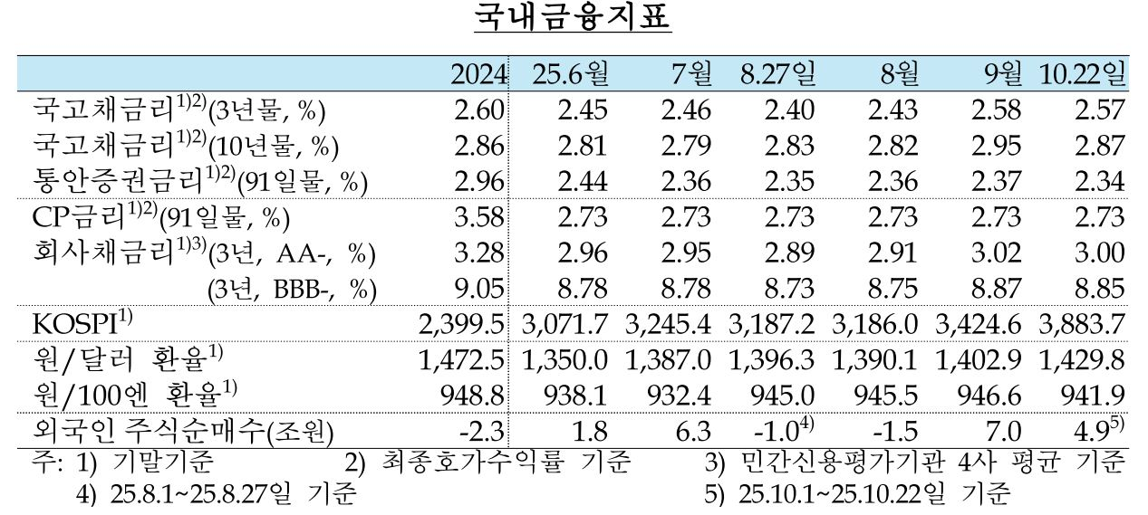 ㅇ 금융·외환시장에서는 안정세가 이어지다가 9월 하순 이후 환율과 금리의변동성이 다소 확대되었다. 원/달러 환율이 대미 관세협상 관련 불확실성, 미‧중 무역갈등 재부각 등으로 상당 폭 상승하였으며 국고채금리는 좁은범위에서 등락하다가 금융안정에 대한 경계감 등으로 높아졌다. 주가는 반도체 업황 호조, 자본시장 제도 개선 기대 등으로 큰 폭 상승하였다.