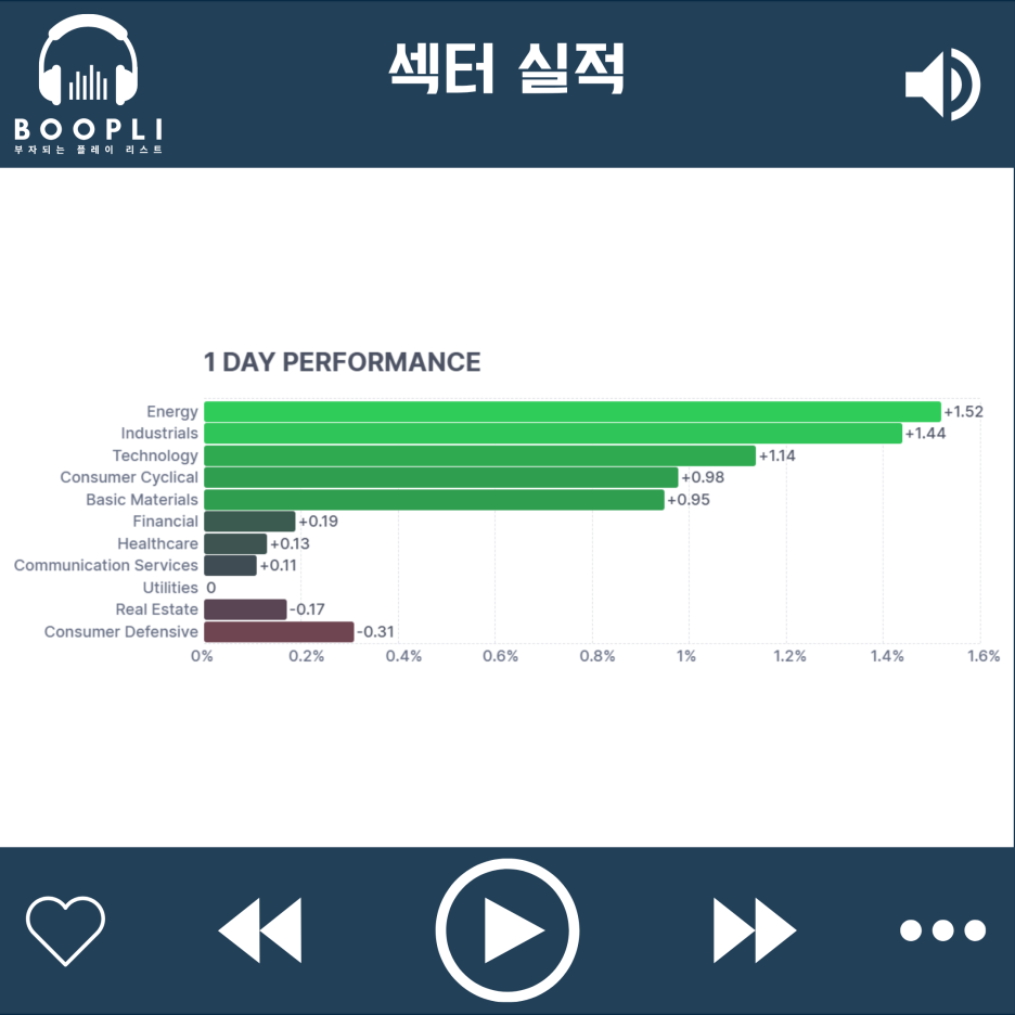 금융, 헬스케어, 커뮤니케이션 서비스, 유틸리티 섹터는 강보합, 경기 방어주, 부동산 섹터는 약보합 마감