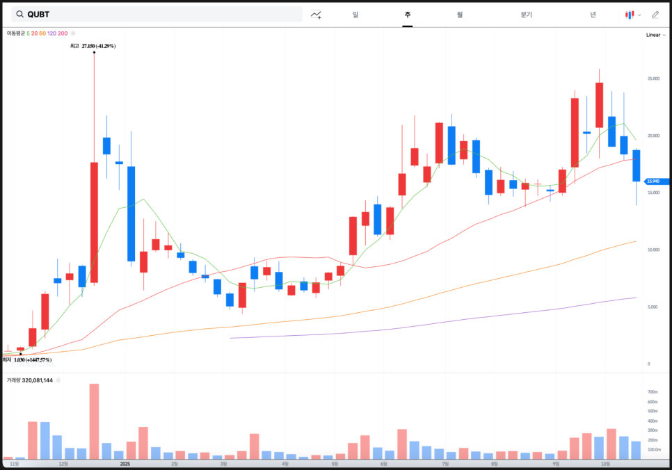 QUBT 일봉 차트는 9월 중순 이후 강하게 치고 올라 고점 25.84달러를 찍은 뒤, 단기 이평선 이탈과 함께 하락 전환이 뚜렷합니다. 현재는 200일선 부근까지 내려오며 하방 압력을 받고 있고, 단기 하락 추세선이 뚜렷하게 형성돼 있습니다. 특히 상승 구간의 거래량 피크 이후 뚜렷한 매수세 둔화가 확인되고 있어, 단기 반등이 나오더라도 강한 매물벽에 부딪힐 가능성이 높습니다.