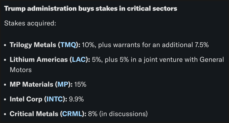 그리고 현재 미국에서는 여러 기업들의 지분을 사들이고 있는 트럼프 정부의 광폭적인 행보를 두고 말이 많은 상황입니다. 우선, 미국 정부가 민간 기술 기업의 지분을 직접 취득하는 방식으로 산업정책을 전개하는 건 매우 이례적인 일입니다. 과거에도 정부 지원이나 보조금, 혹은 간접적인 보증 형태로 기업을 돕는 사례는 많았지만, 지금처럼 정부가 명확한 지분을 가지고 최대 주주 수준으로 올라서는 방식은 사실상 전례에 가깝습니다.