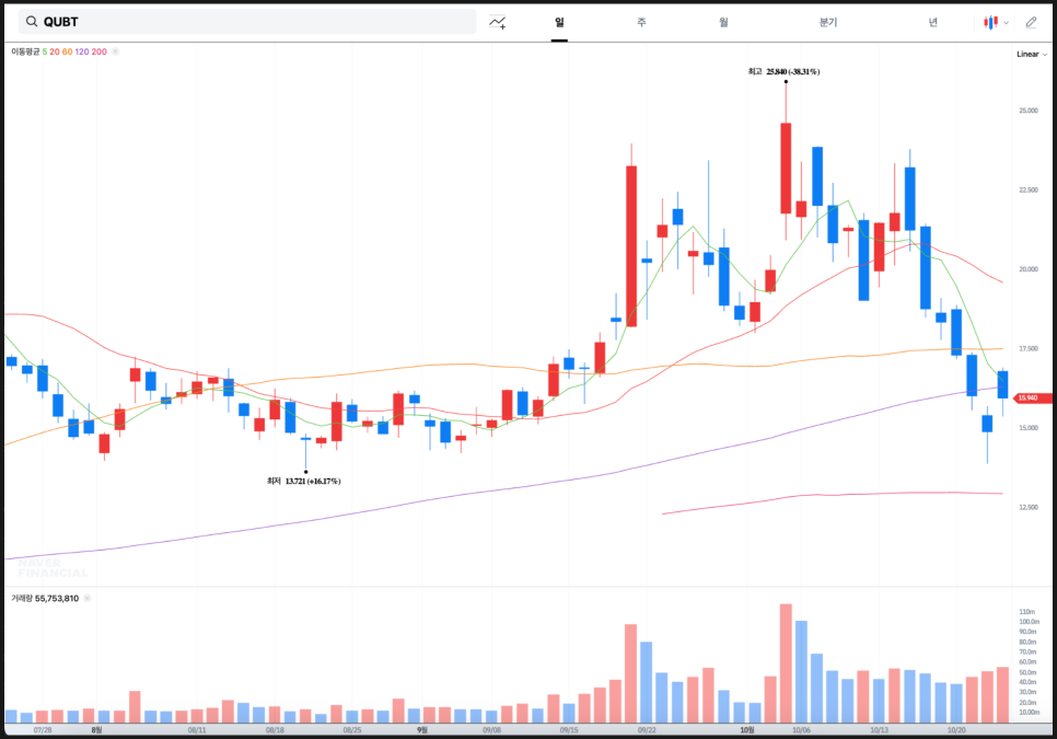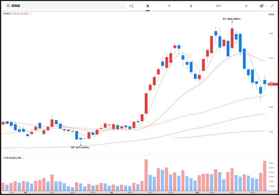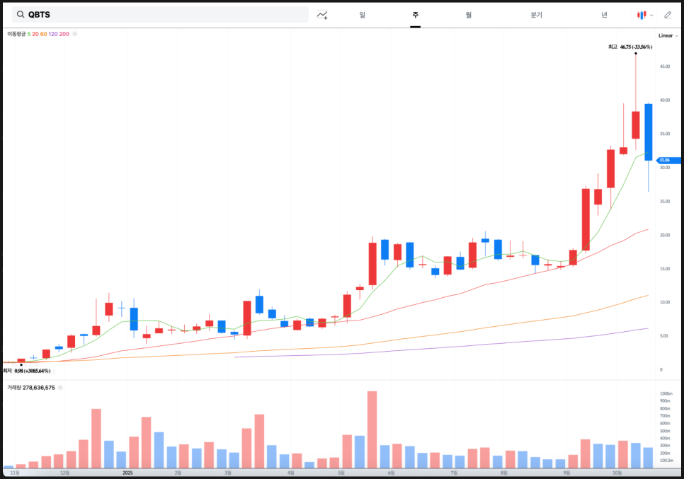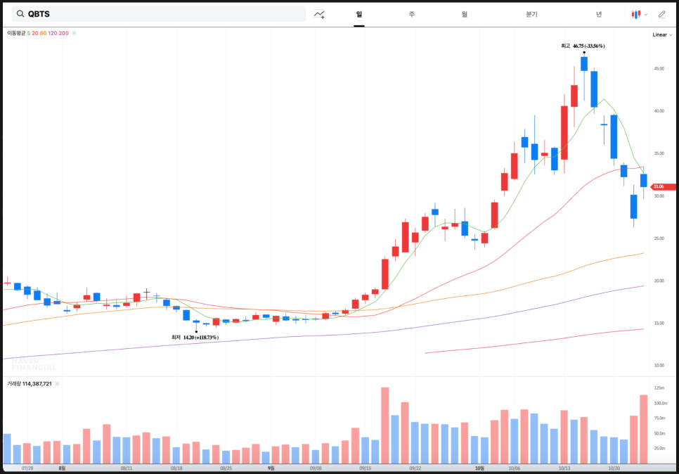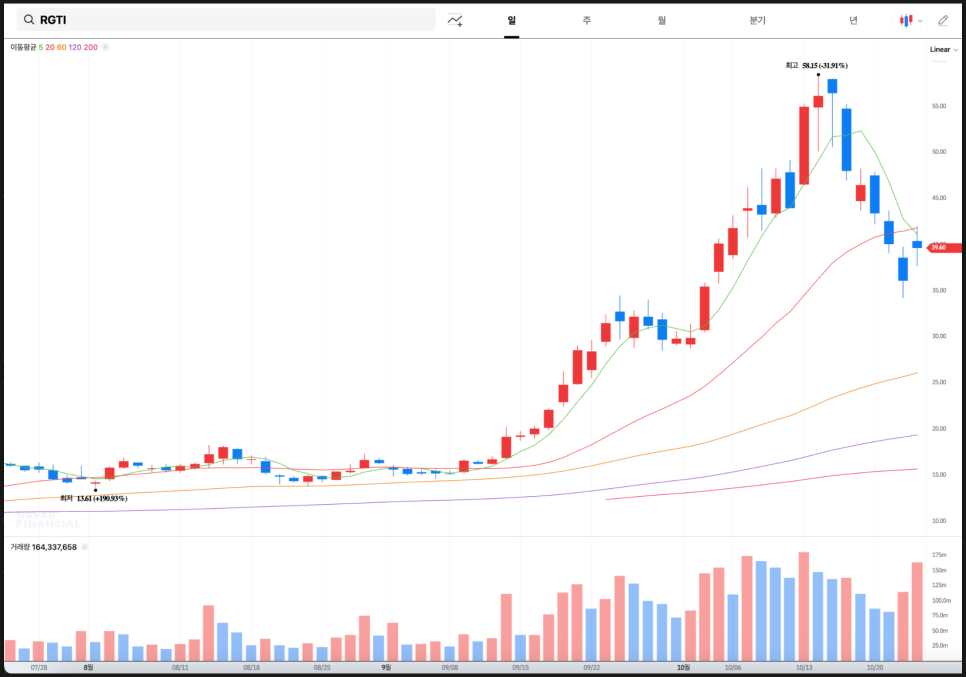 RGTI 역시 거의 비슷한 패턴을 그리고 있습니다. 10월 초 최고가 58.15달러를 기록한 뒤 단기 급락세가 이어졌습니다. 일봉 차트에서는 20일선 아래로 주가가 떨어지며 조정이 진행되고 있고, 거래량도 상승 구간보다 확실히 줄어든 모습입니다. 단기 상승 랠리의 피로감이 노골적으로 드러나는 구간입니다.