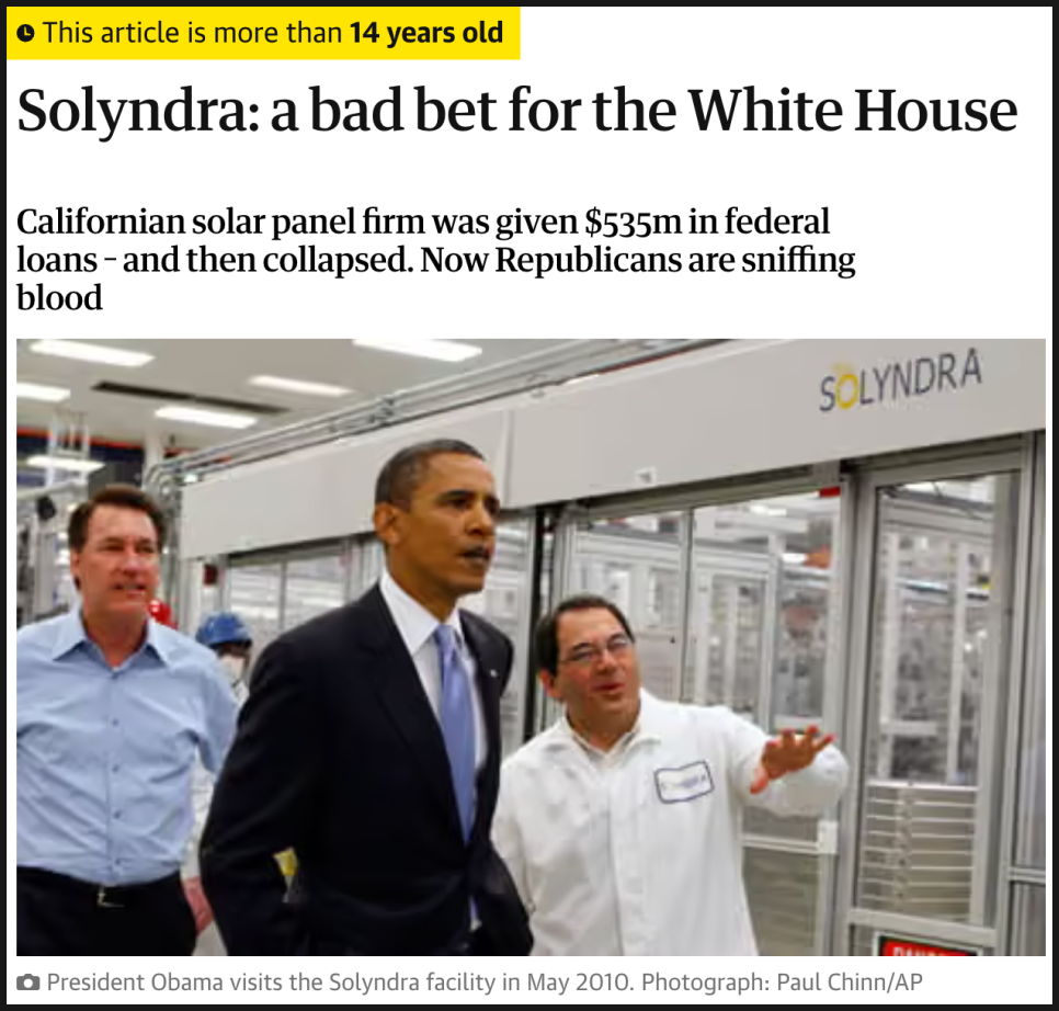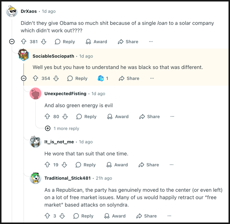 스레드의 시작은 “이건 완전히 조작된 뉴스다, WSJ는 믿을 수 없다”는 글에서 비롯됐는데요. 이어 댓글창에는 오바마 행정부 당시의 ‘솔린드라 사태’와의 비교가 잇따랐습니다. 당시 정부가 태양광 기업에 지원했다가 파산하면서 세금이 낭비됐다는 점을 들어, 이번 조치도 비슷한 전철을 밟을 수 있다는 우려가 제기된 겁니다.