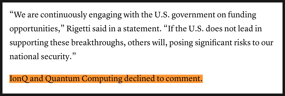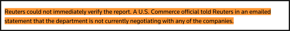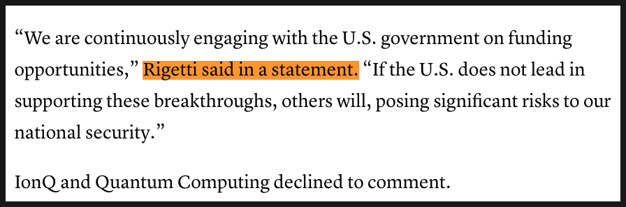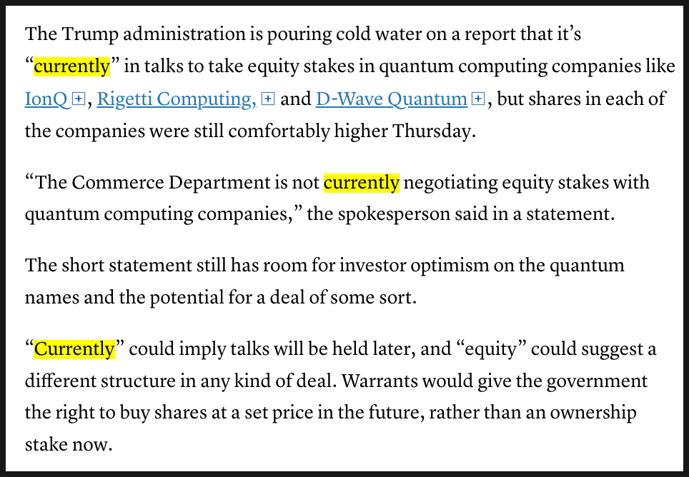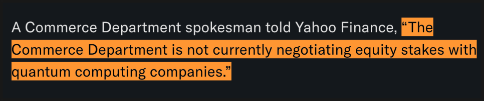 표면적으로는 WSJ 단독보도를 전하는 인용 기사였으나, 동시에 “월스트리트저널의 내용을 즉시 검증할 수 없었다”고 전했습니다. 상무부 관계자의 이메일 답변을 인용해 “현재 어떤 양자컴퓨팅 기업과도 지분 투자 협상을 진행하고 있지 않다”고 보도한 건데요. 이번 사안과 관련해 나온 첫 번째 공식 부인으로, 월스트리트저널의 단독 보도에 제동을 건 셈입니다.