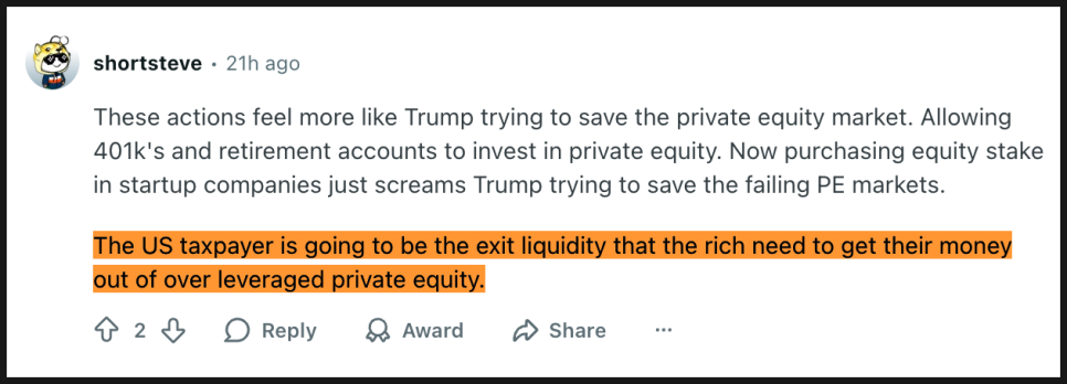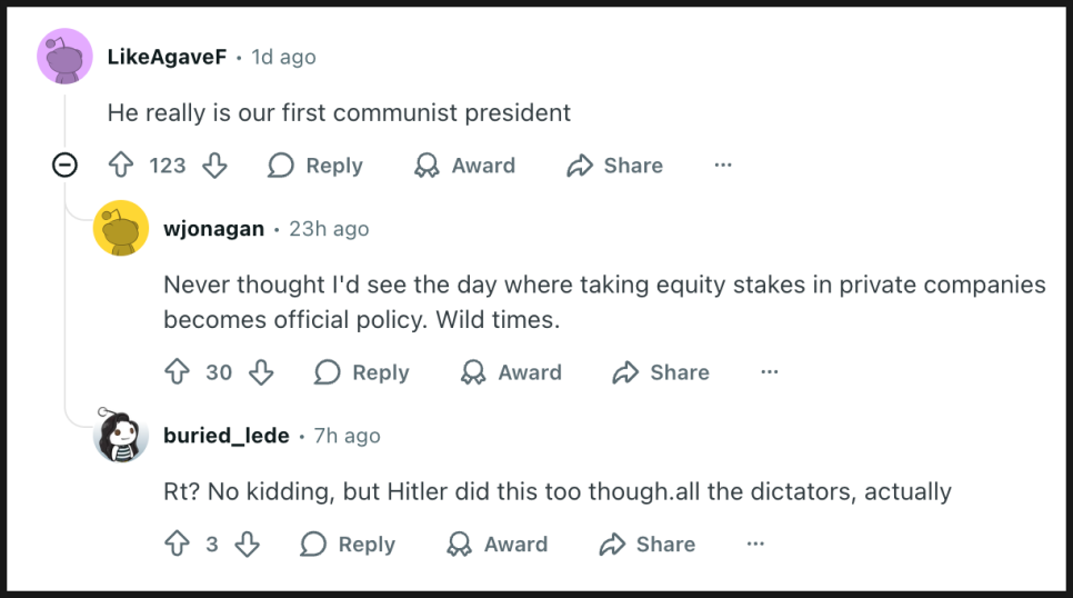 흥미로운 것은 ‘지분 투자 자체가 자유시장 원칙과 충돌한다’는 시각입니다. 한 사용자는 “정부가 민간기업 지분을 갖는 게 공식 정책이 되는 날이 올 줄 몰랐다. 미쳤다”고 했고, 또 다른 사람은 “트럼프가 개인적으로 이익을 챙기려는 전형적인 시나리오다. 이런 구조는 부패의 온상”이라고 비판했습니다.