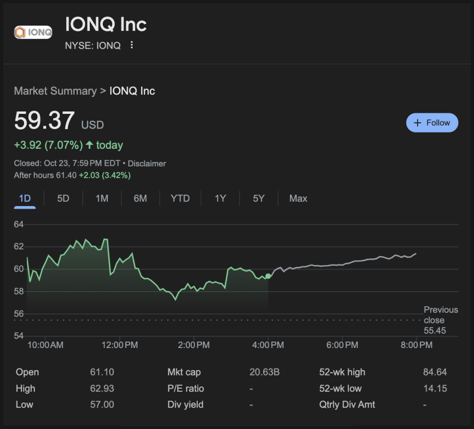 이날 IONQ(아이온큐)는 7% 급등 후 시간외장에서 3.4% 추가 상승했고,