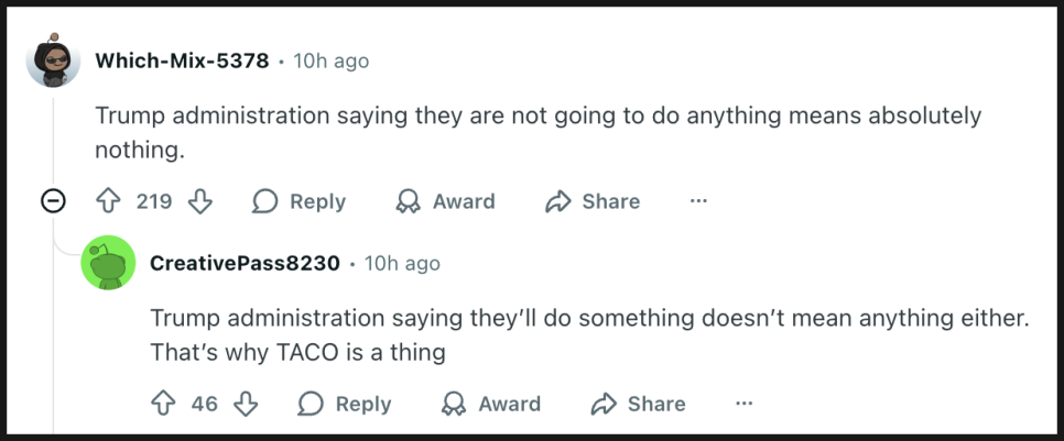 첫 번째로 가장 많이 언급된 건 트럼프 행정부의 신뢰성 부재였습니다. 한 이용자는 “트럼프 행정부가 ‘안 한다’고 말하는 건 아무 의미가 없다”고 잘라 말했고, 다른 사용자는 “사실 ‘한다고 말하는 것’도 아무 의미 없다”며 조롱 섞인 반응을 보였습니다.